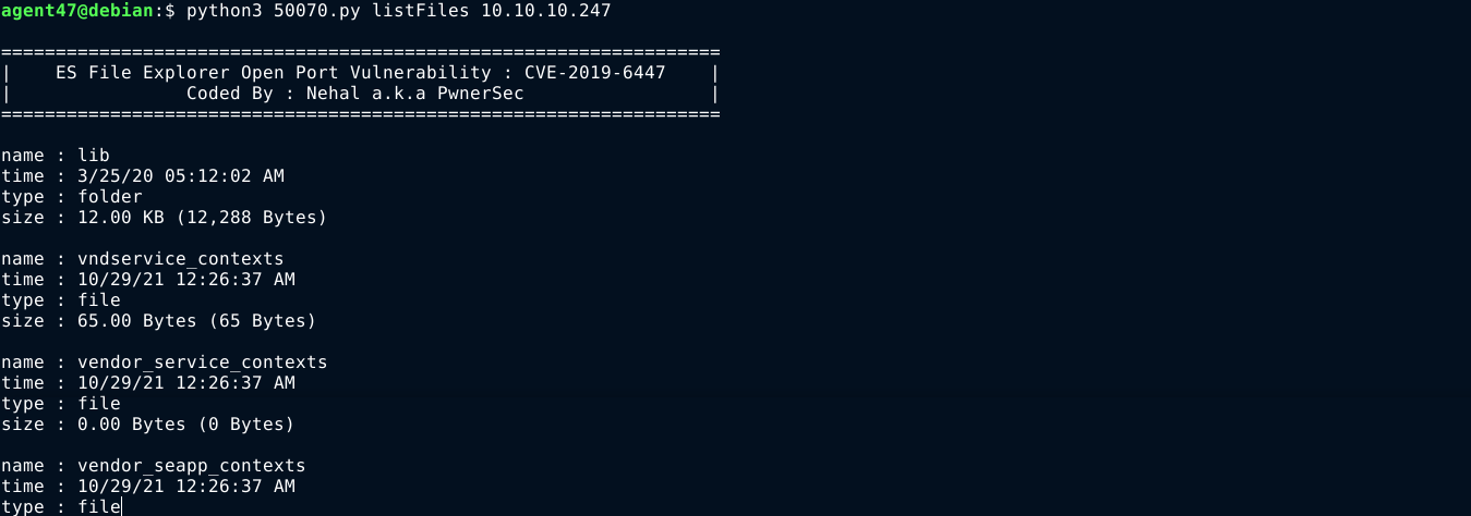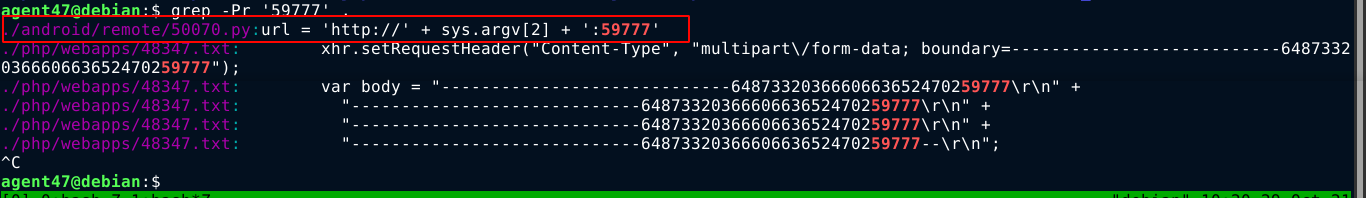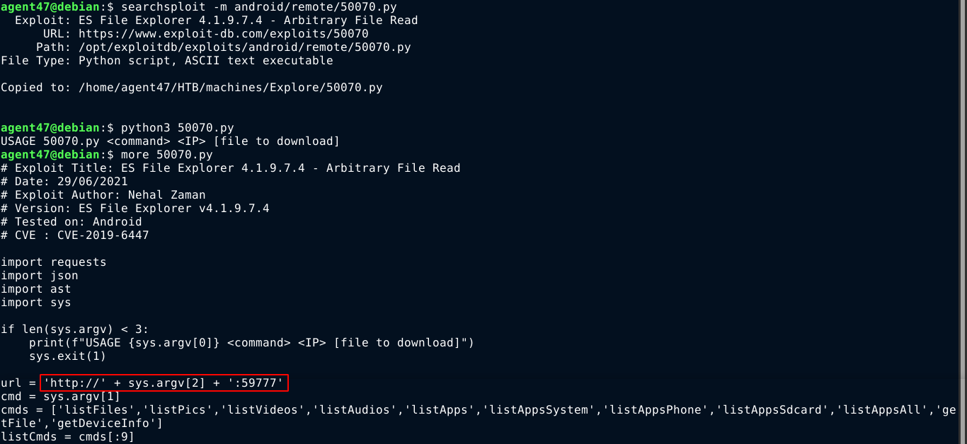 At this point, I went back to recon, and found that the service on port 59777 may actually be an ES File Explorer service after a search on exploitdb showed an exploit that targets port 59777 on android. searchsploit doesn’t have any option to search exploit contents, atleast none that I know of, so I had to use grep on the path where exploitdb store it’s exploits;