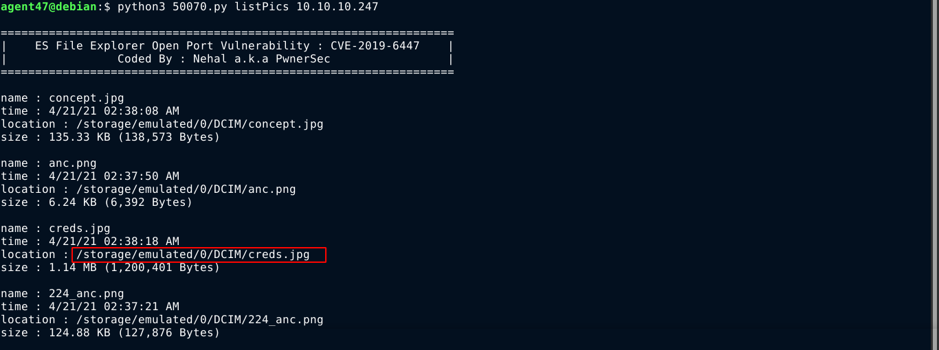 Testing the other commands implemented in the exploit, the listPics command showed an interesting file;