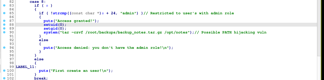 As you can see above, we were able to overwrite the role parameter and set it to admin, which should now give us access to the vulnerable notes backup feature. I created a script named tar in /dev/shm with the payload;