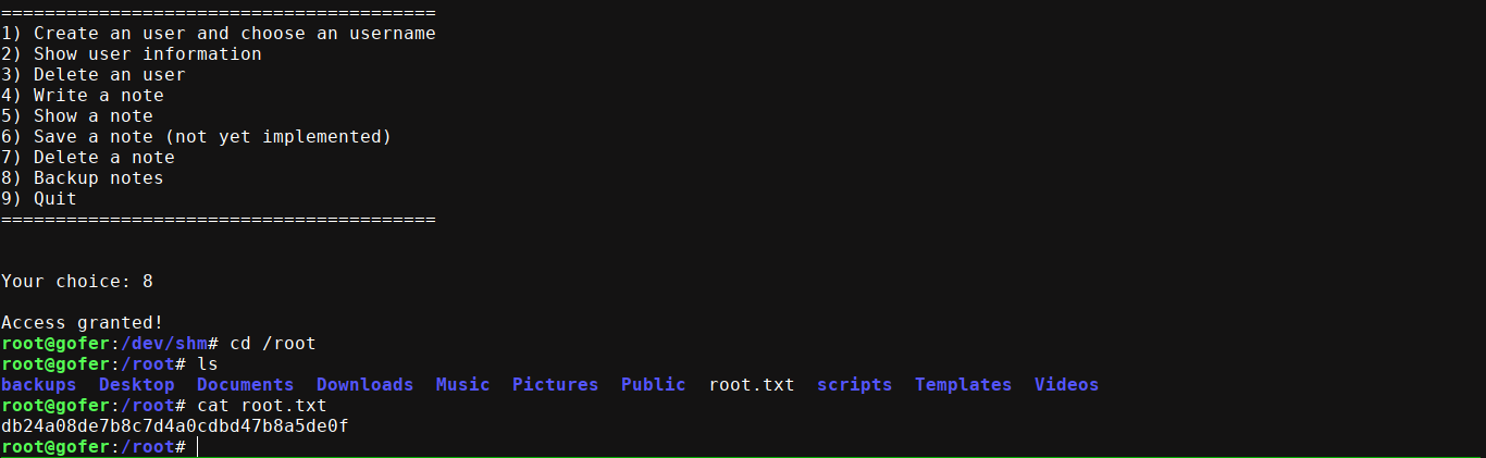 I then made it executable and added it to my $PATH variable. I then exploited the UAF and called option 8, which gave me a shell on the box as root;