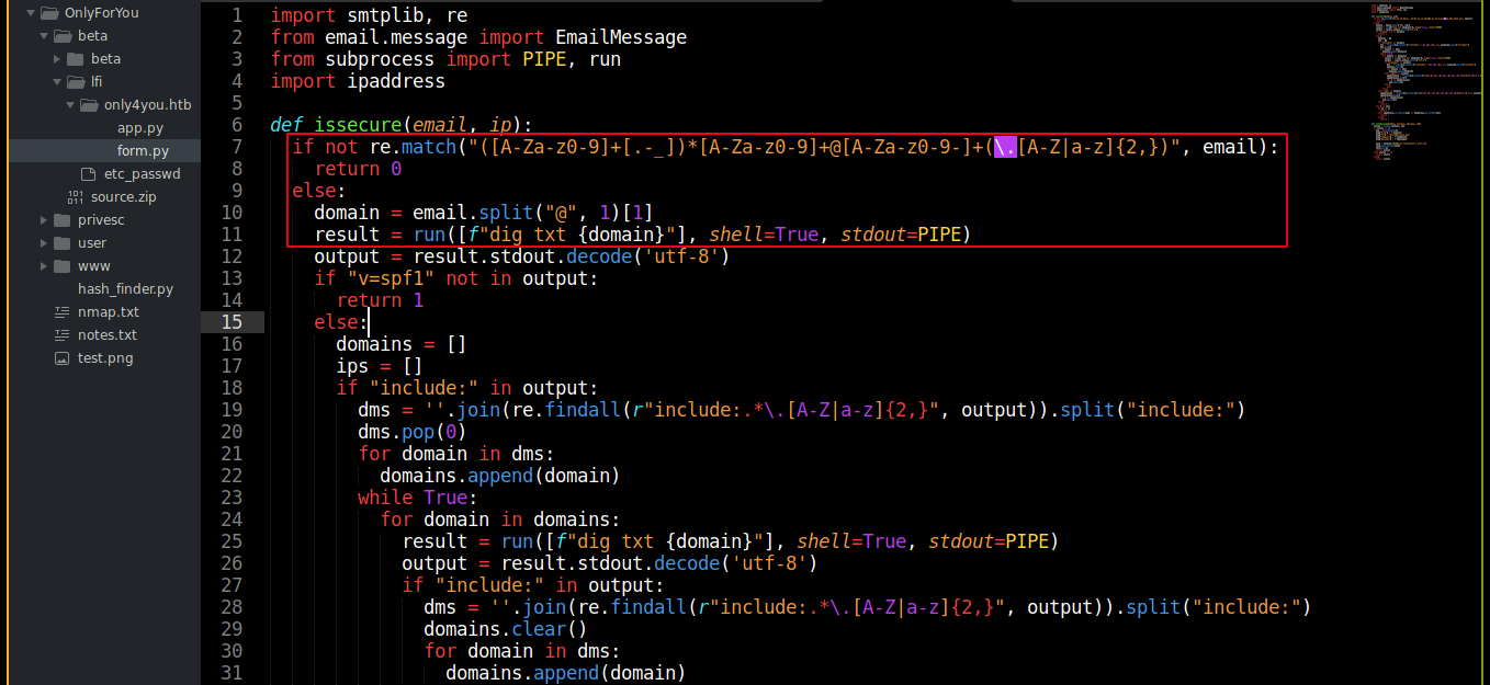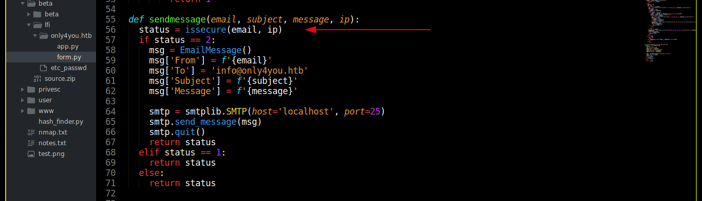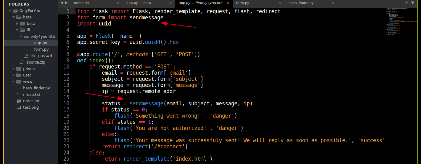 Since beta.only4you.htb is a flask app, I checked for app.py in the web root of only4you.htb, and it exists. The app.py file imported sendmessage from a module named form (form.py), which was also dumped;