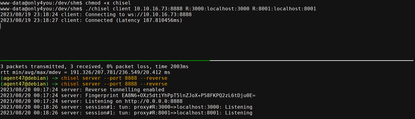 So I uploaded chisel and setup a reverse tunnel for port 3000 and 8001;