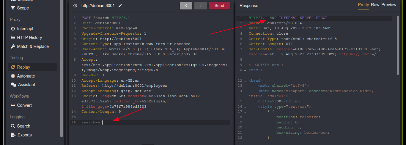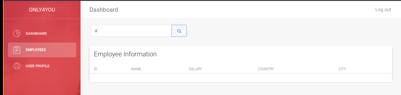 The employees tab has a search feature that throws a 500 error after adding a single quote in the search query;