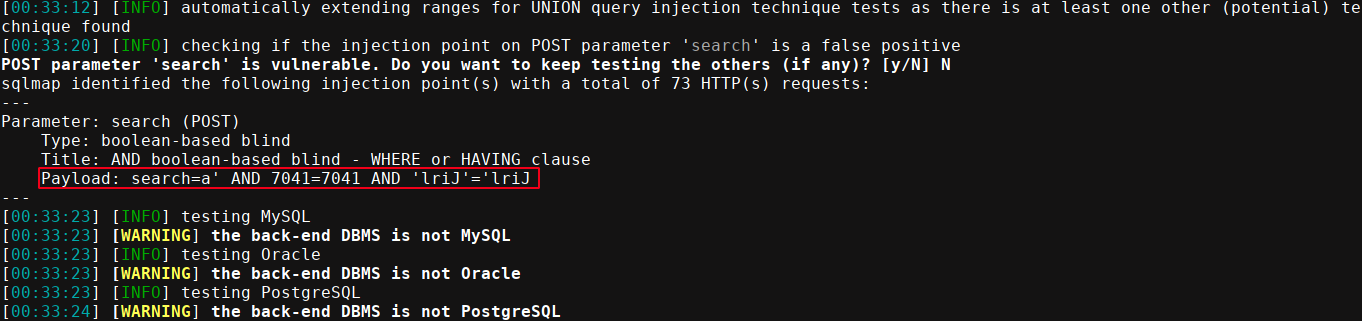This indicates a possible SQL injection, so I passed it to sqlmap, which flag it as vulnerable, but was not able to detect the type of database management system (DBMS) in use;