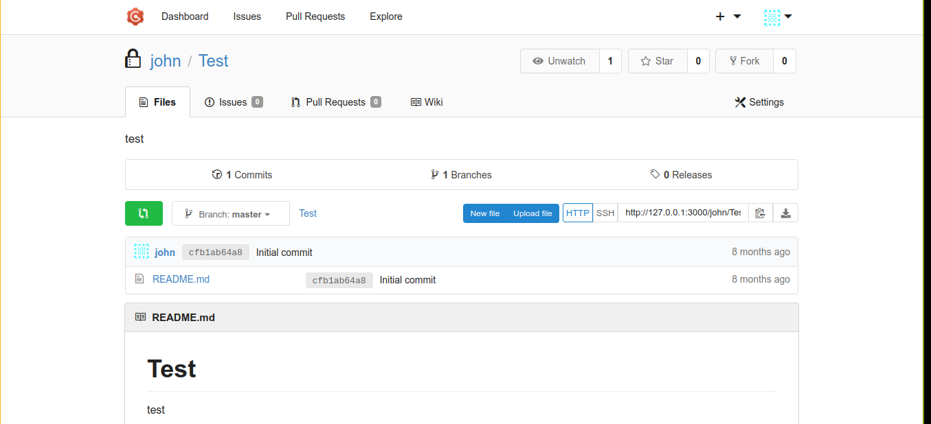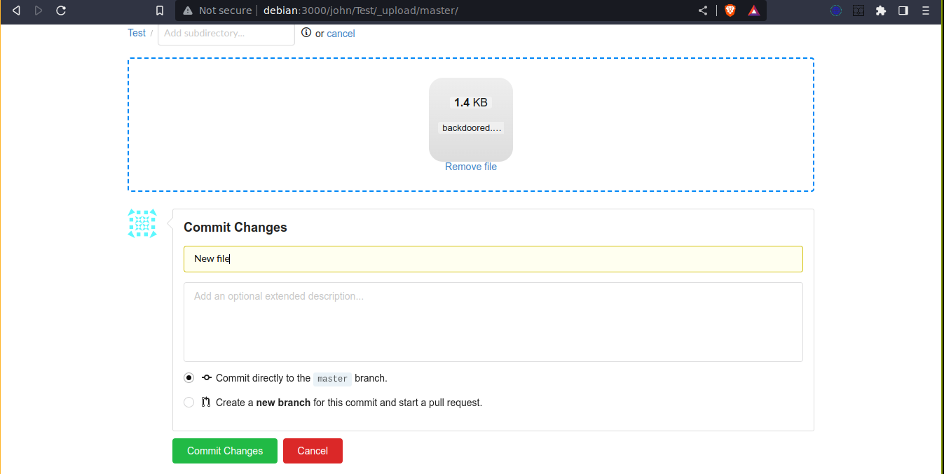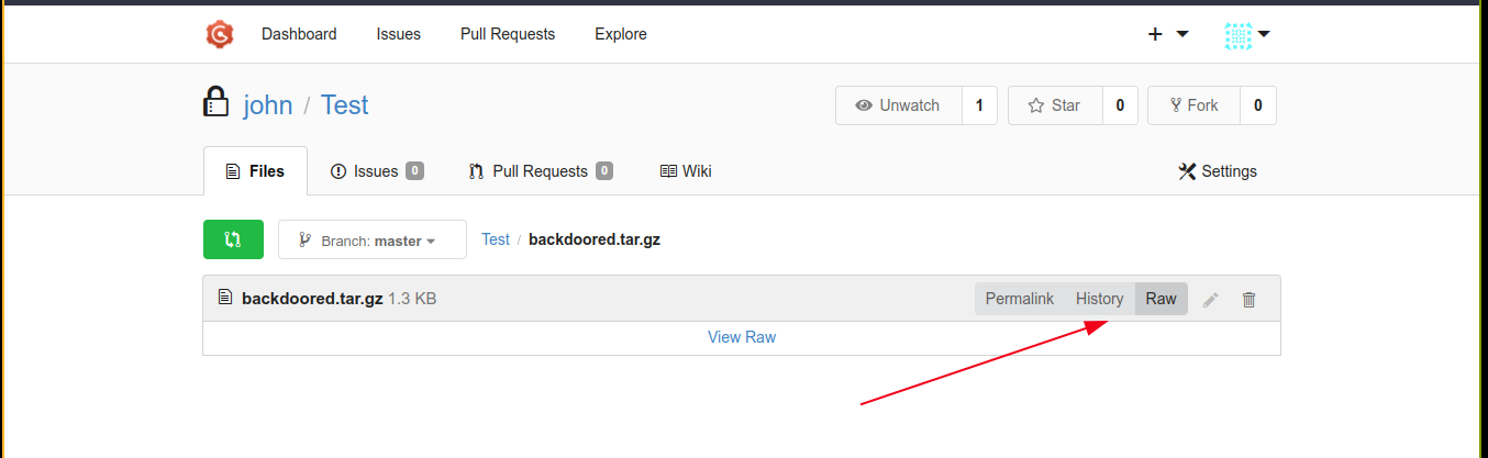I then copied the raw URL, which is http://127.0.0.1:3000/john/Test/raw/master/backdoored.tar.gz