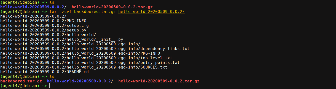 I then packaged it back as backdoored.tar.gz and upload it to the Test repo;