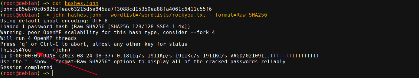 This looks like a SHA256 hash. We already know the password of admin, so no need to crack it. Saving the hash of john into a file, I was able to crack it using John the Ripper;