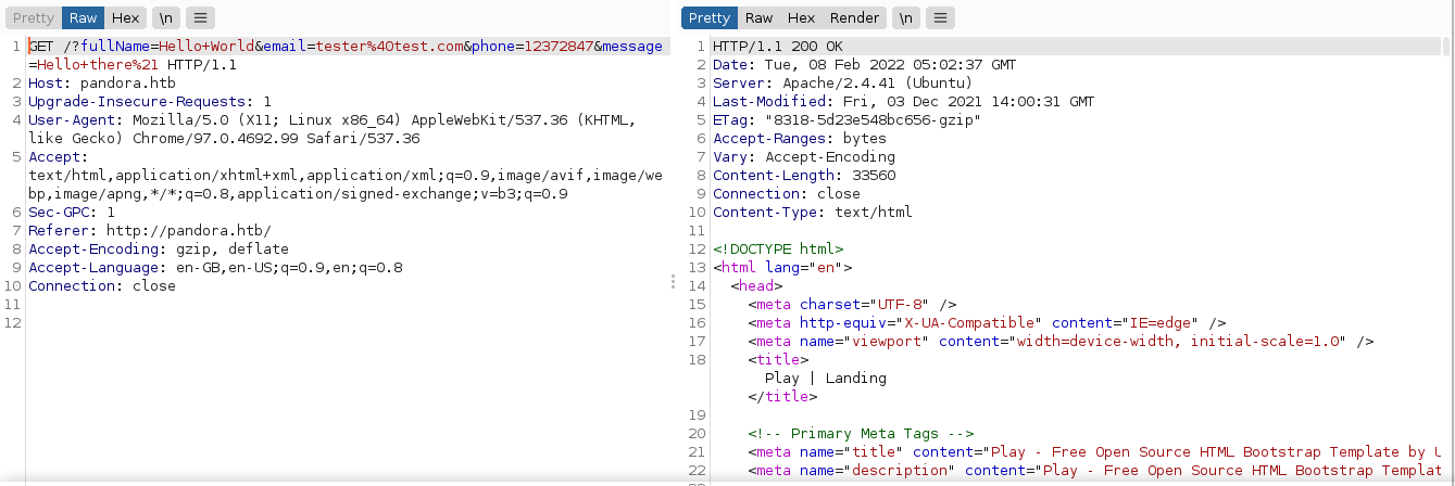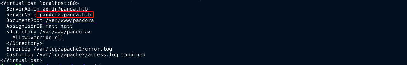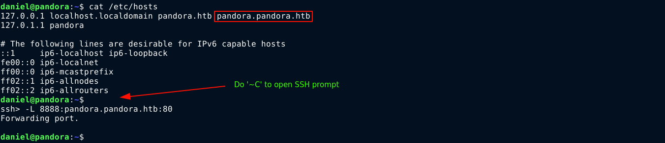 I added the hostname to my /etc/hosts file, but was unable to access it as on request the server simply returns that static web page at pandora.htb/. Notice in the first line of the Apache2 config that the hostname for the virtual host is localhost. This means the domain is accessible only locally. So with my SSH access into the box, I setup an SSH tunnel so I can access the site over port 8888 on my attack host;