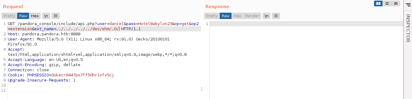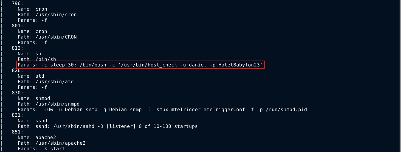 Bruteforcing the web root for hidden files, and also for hidden subdomains didn’t give me anything of use. A quick UDP port scan with NMAP showed port 161 (SNMP) is open. So I scanned it deeper with -sU -sC -sV flags, and found a credential daniel:HotelBabylon23 that is being passed to a script as command line argument;