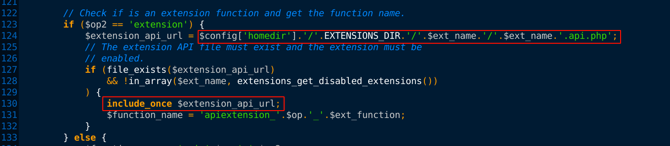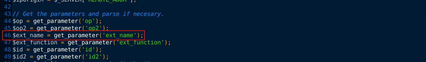If I can control the value assigned to the variable $ext_name, I can control the file that will be included, which I could exploit to load PHP files for arbitrary code execution. Turns out I can, because $ext_name is assigned the value of a GET parameter;