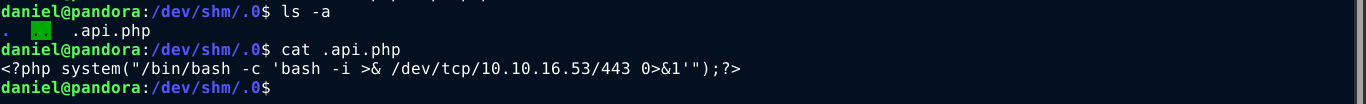 So I logged back into the box and into /dev/shm/.0 directory, and created a PHP script named .api.php containing my reverse shell;