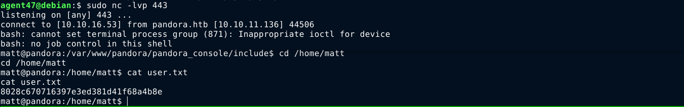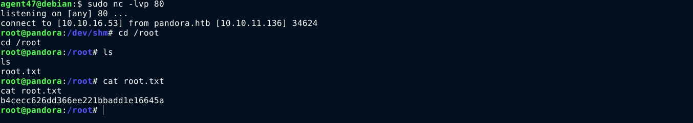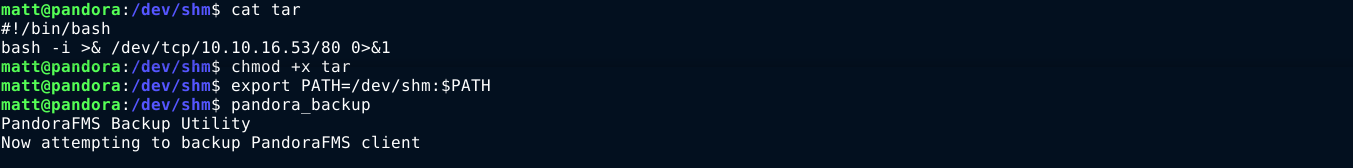Using my shell on the box as matt, I moved to a writeable directory, created a file named tar containing a reverse shell, made it executable, added it to the $PATH variable, and called the pandora_backup script. This gave me root access to the box;