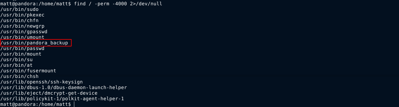 The user matt does not have sudo permissions on any file in the box. Searching for SUID binaries gave an interesting result;