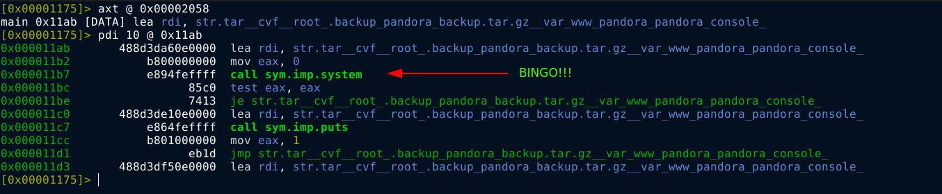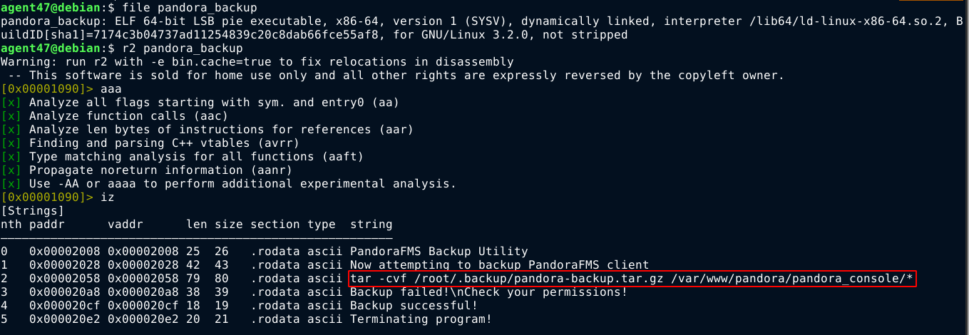 It’s a binary file, so I shipped it over to my attack host and opened it in radare2. Dumping strings contained in the binary revealed a possible command that could be vulnerable to path tampering;