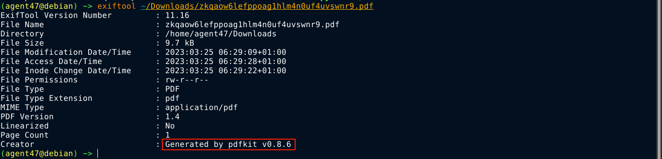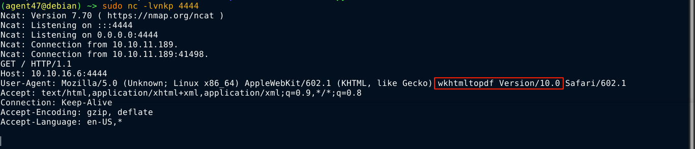 wkhtmltopdf is a utility for converting HTML pages to PDF. My searches for exploits lead me to this article, but had no luck with it on the box. Looking at the metadata of the generated PDF file;