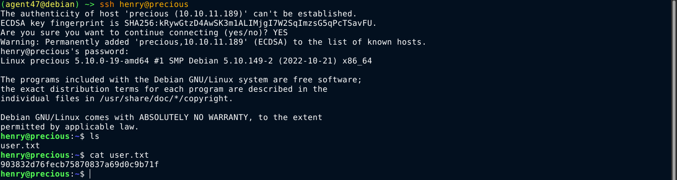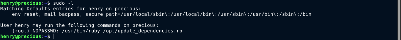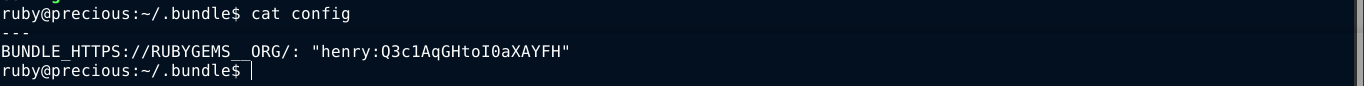 Ruby does not have user.txt. Another user in the box exists with the name henry. Looking into ruby’s home directory, the creds of henry were found in /home/ruby/.bundle/config;