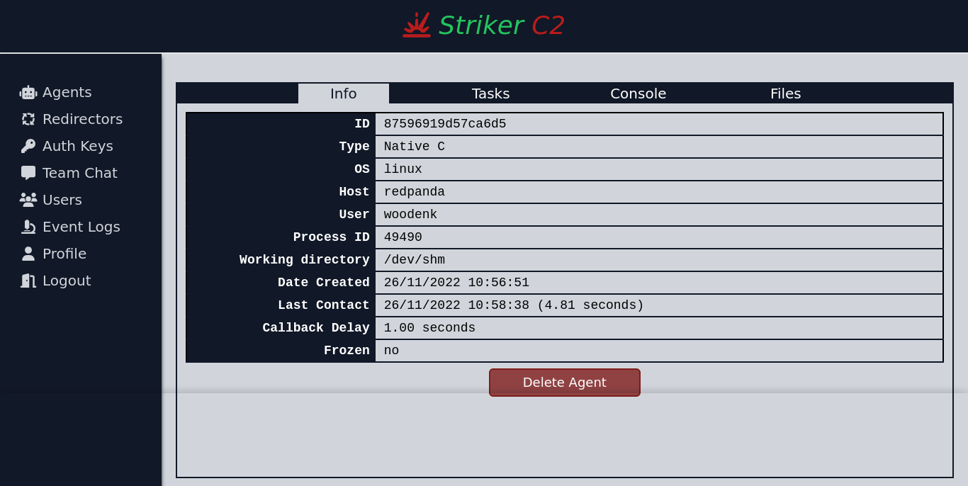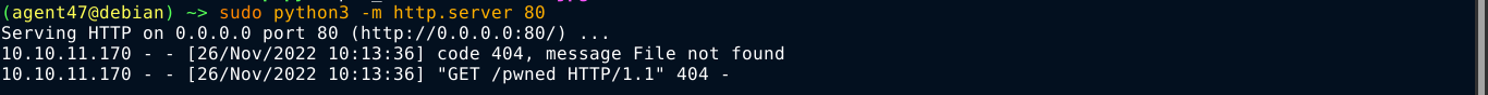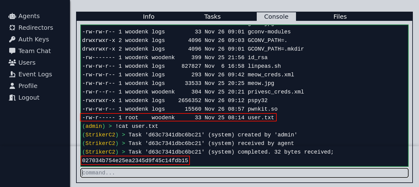 Attempts to directly run a BASH reverse shell one-liner kept failing. But the box has wget, and I was able to use it to download and execute Striker, which gave me a session on the box as the user woodenk;