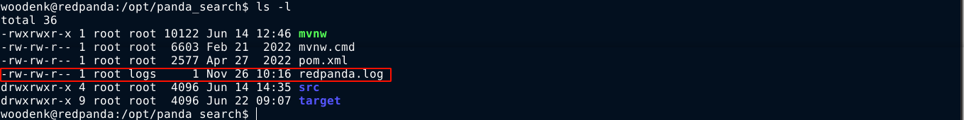 Looking at the main() function, it seems the app is processing /opt/panda_search/redpanda.log. Looking at the file perms, we can write to it because woodenk is in the logs group;