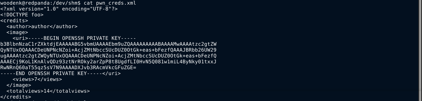 I uploaded the above file as /dev/shm/pwn_creds.xml, which will be what the program will resolve the ../../../../../../../dev/shm/pwn payload added to the image metadata.