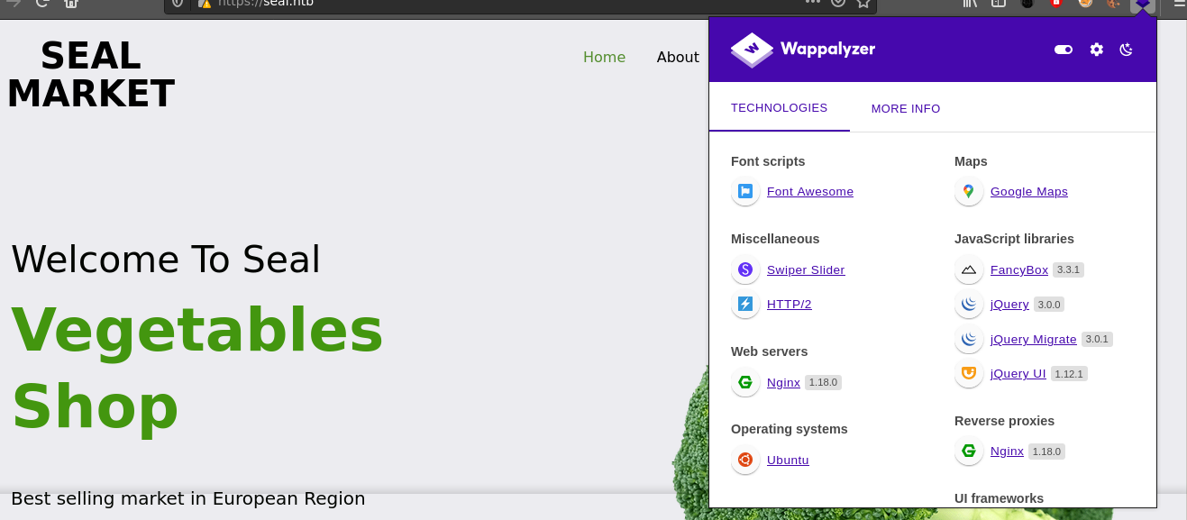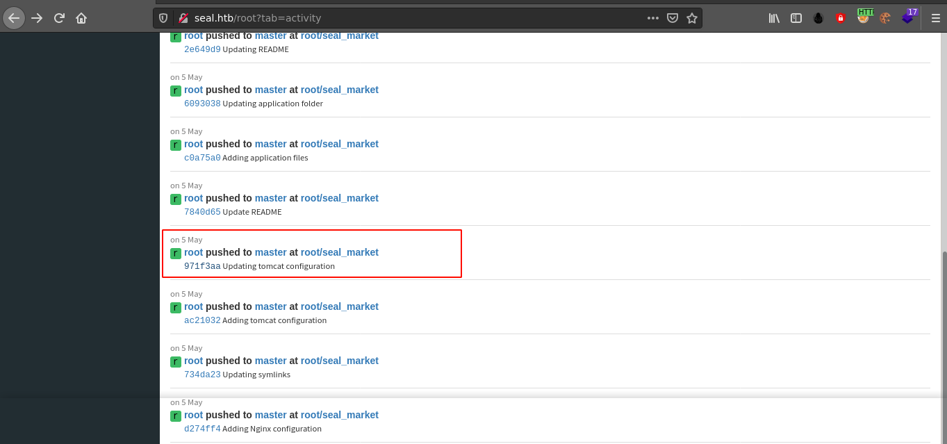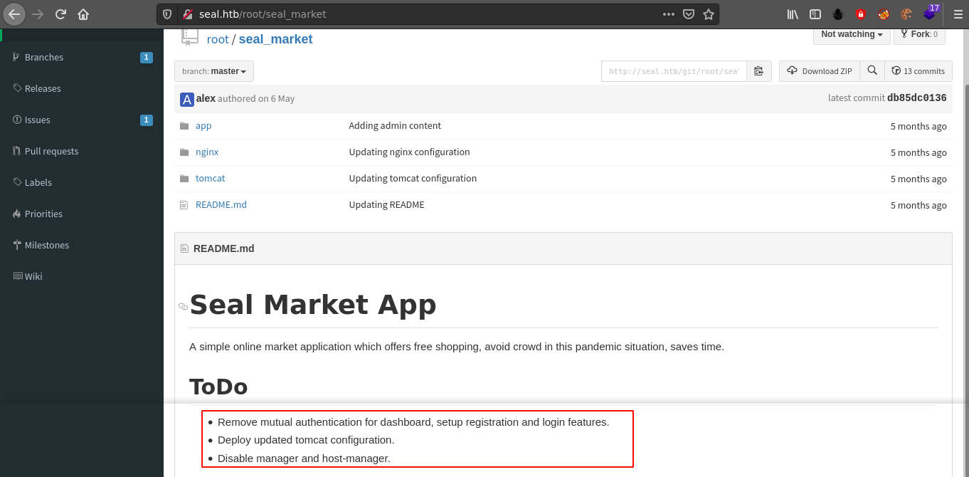 The seal_market repo owned by root is of interest as it’s contents match that of the web page at https://seal.htb/. It also contains the name of the box, and some administrative todo list in the README file;