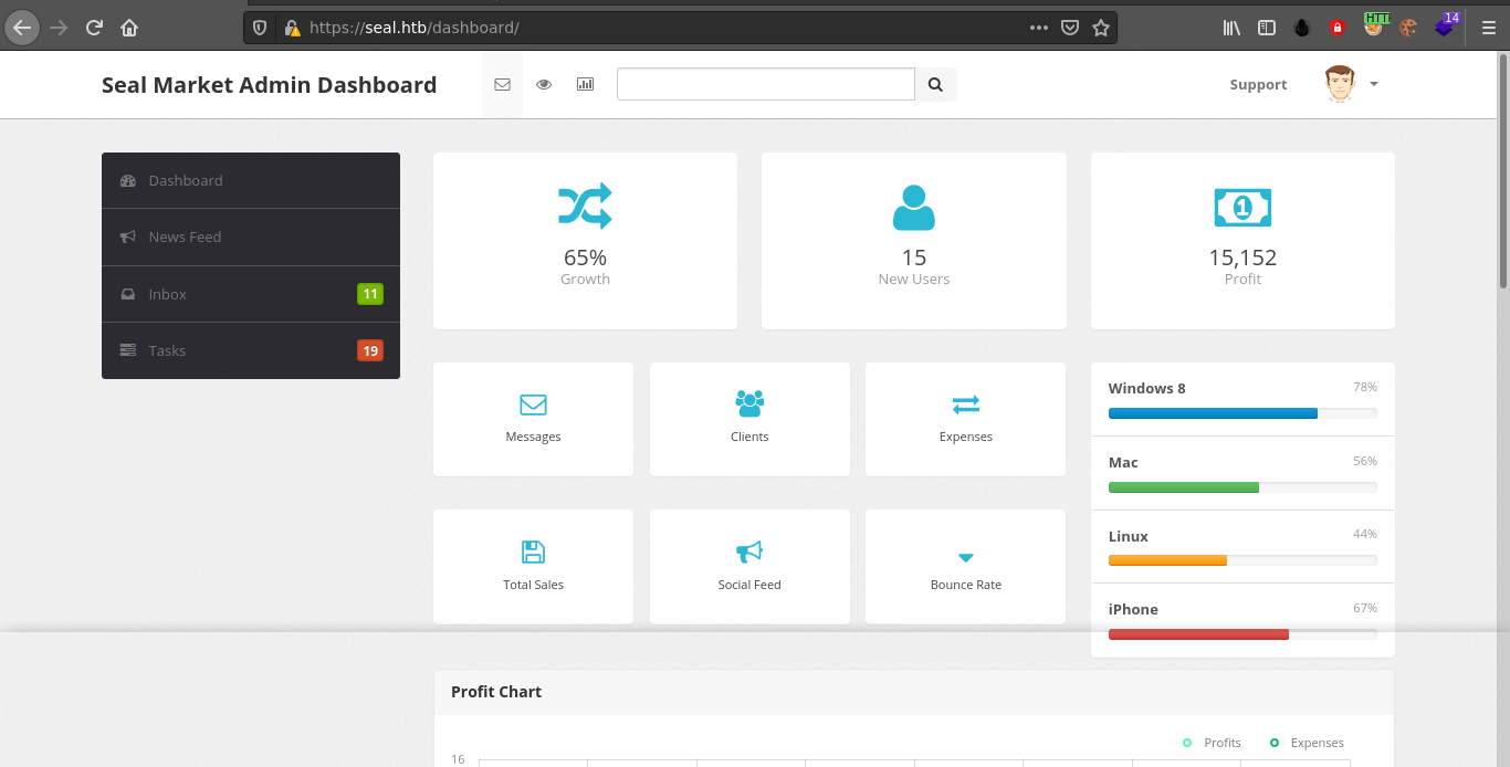 Another page of interest is /admin, which on request redirected me to http://seal.htb/admin/, which failed because the NMAP scan earlier showed no service running on port 80. Since NMAP previously identified a web proxy on port 8080, I enabled this proxy in Firefox using the FoxyProxy plugin, and gained access to the page;