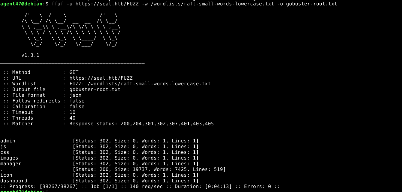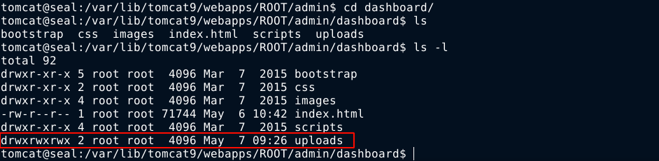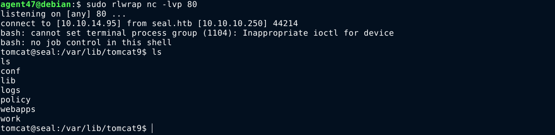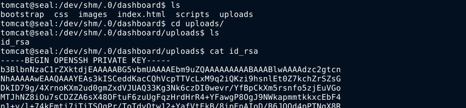 Going to https://seal.htb/webshell gave me a foothold into the box as the tomcat user, which I used to spawn a bash reverse shell back to my attack box;