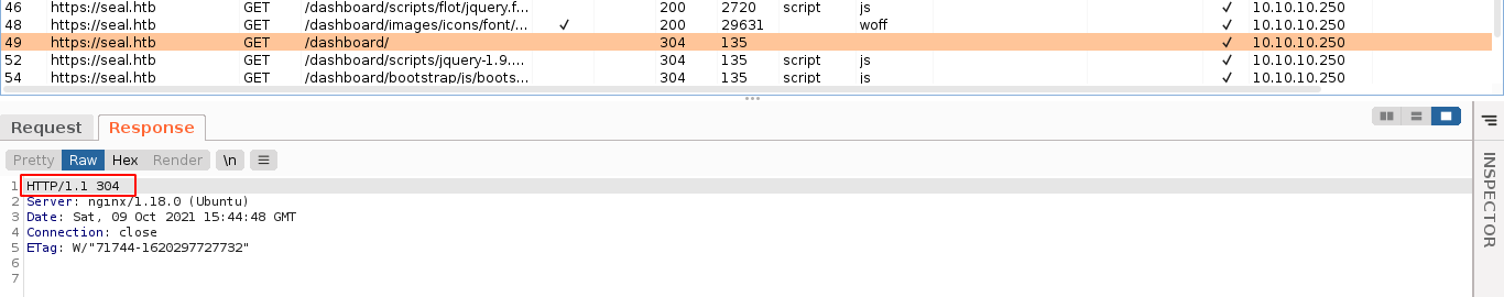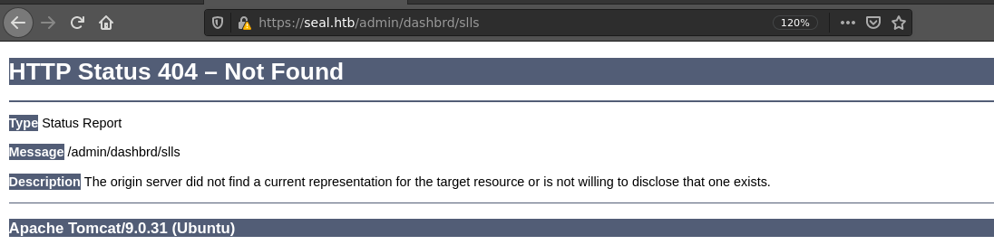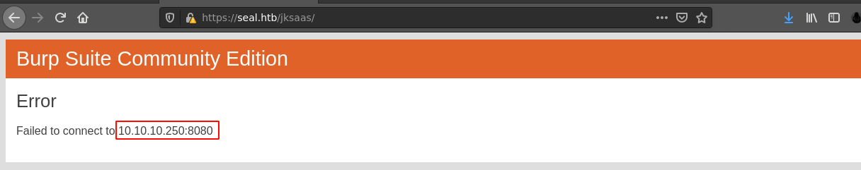 While requests for https://seal.htb/dashboard/ succeeded, any other request to a path through Burp Suite gave me the error;