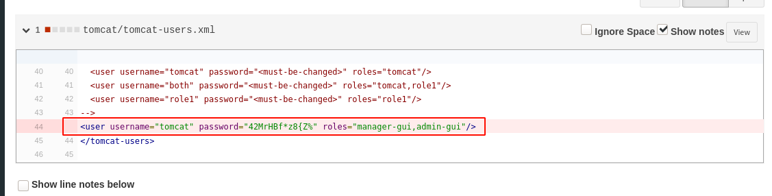 Going through the users homepages, the user root has the highest entries in activity log. One commit stands out as it mentioned an update to Tomcat’s configuration file;