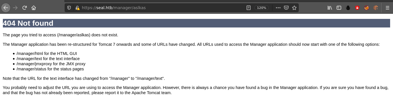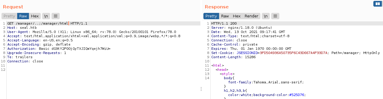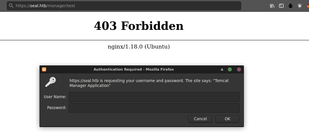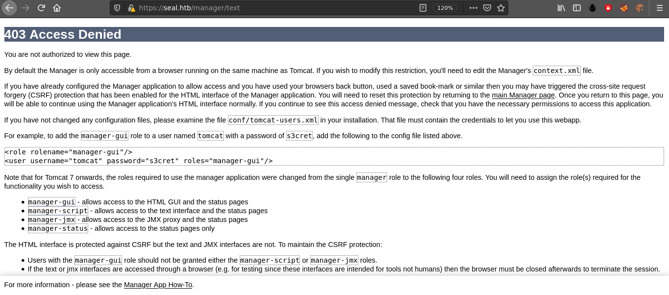 - Used the tomcat credential for a web login at https://seal.htb/manager/text, which succeeded, but access was blocked by nginx reverse proxy.