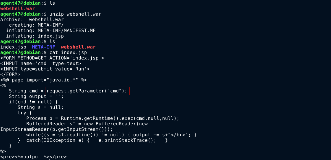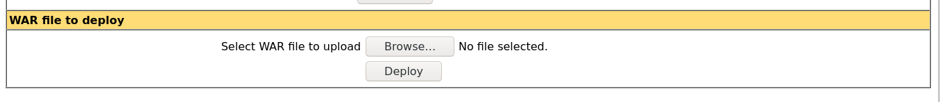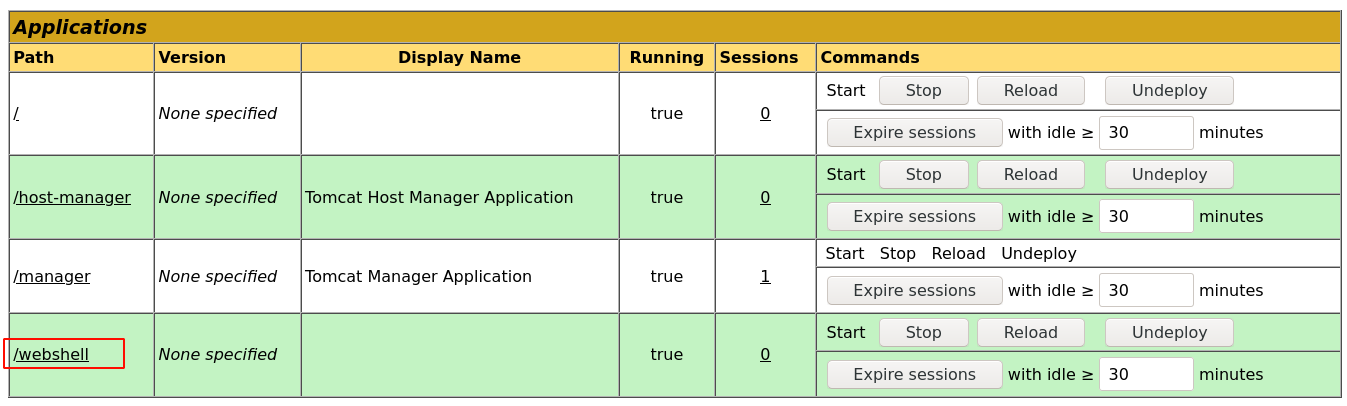 Since .war files are used to package .jsp web apps, I found a webshell on Github, uploaded it, and deployed it on the server;