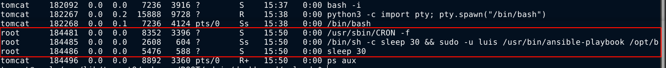 Dumping a list of all running processes indicate the program ansible-playbook is being executed by a cron job as luis with the above .yml file as an argument, likely after every 30 seconds judging from the sleep 30 instruction;