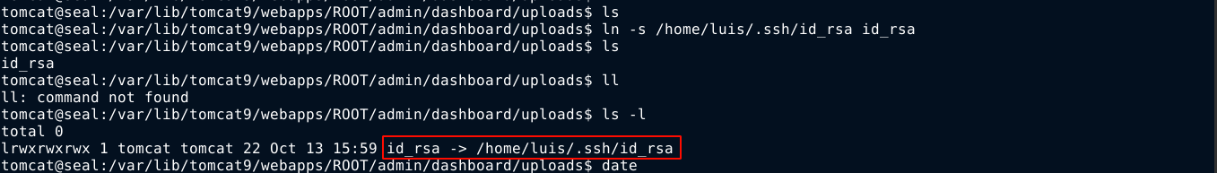 Since there is a .ssh directory in the home of the user luis, it is likely this user has SSH public key authentication configured, so I moved into the writeable uploads directory and create a symlink to the SSH private key, which will be at /home/luis/.ssh/id_rsa. This is possible because you don’t need any permission on a file before you can create a symlink to it;