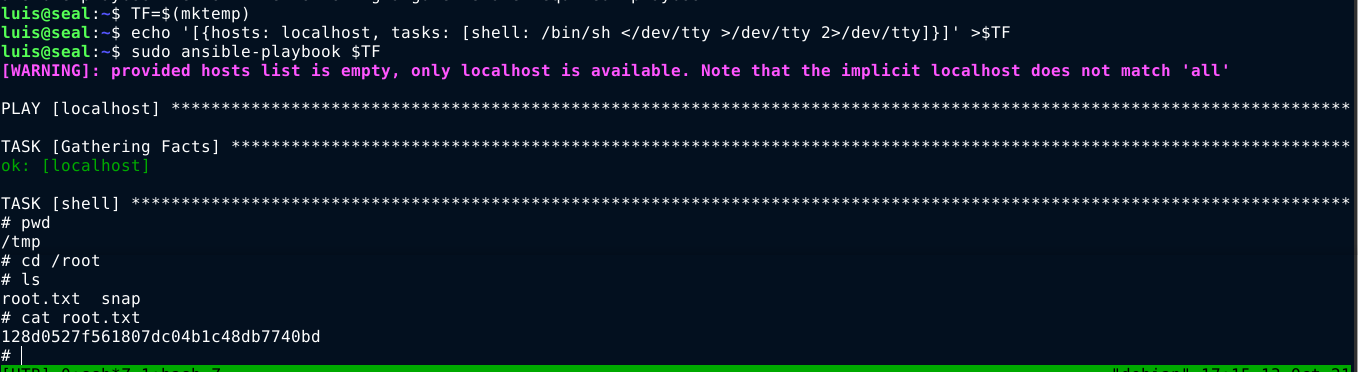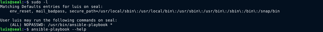 Inside the host as luis, I have permission to run /usr/bin/ansible-playbook with any argument as root using sudo. Since this is a standard program, I look it up in https://gtfobins.github.io, and got a hit;