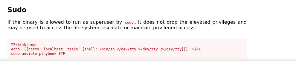 ansible-playbookwith any argument as root. - Found a privilege escalation exploit on https://gtfobins.github.io, which gave me root access to the box.