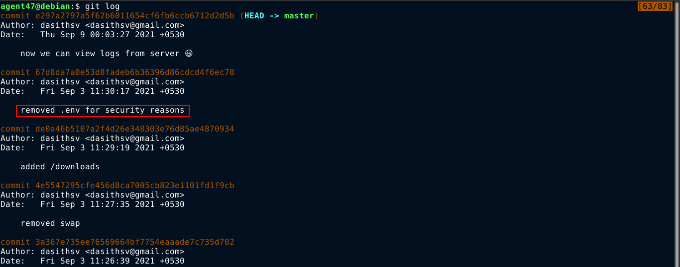 It is a ZIP file, which I download and extract. It contains a .git folder in the root, so it’s a GIT repository. Running git log command showed something interesting;