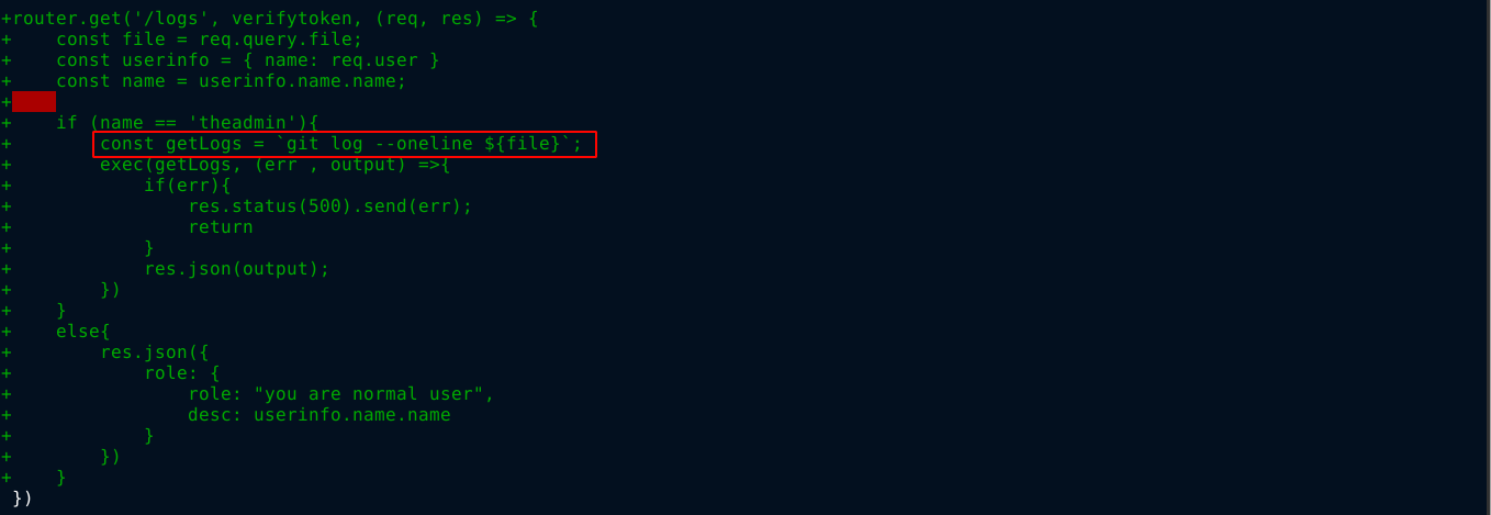 Using the package.json file in the root of the repo, which contains dependencies of the project and their version numbers, I started looking for exploits online, but couldn’t find anything interesting. So I continue to enumerate previous commits using git diff, and found an interesting commit with the ID e297a2797a5f62b6011654cf6fb6ccb6712d2d5b;