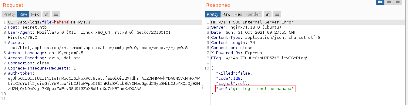 That looks like a shell command that can be exploited if I can control the value of req.query.file. Crafting a request in Burp Suite for the endpoint, I got this;