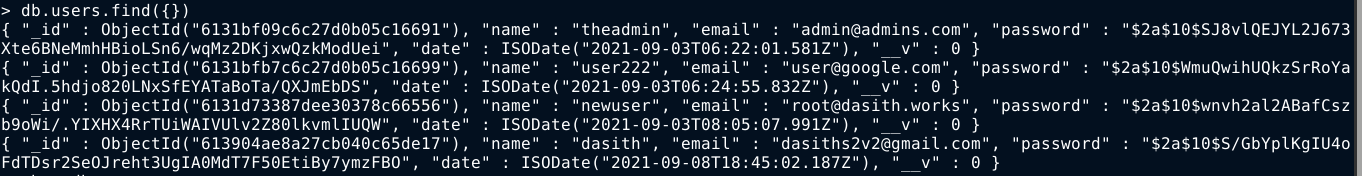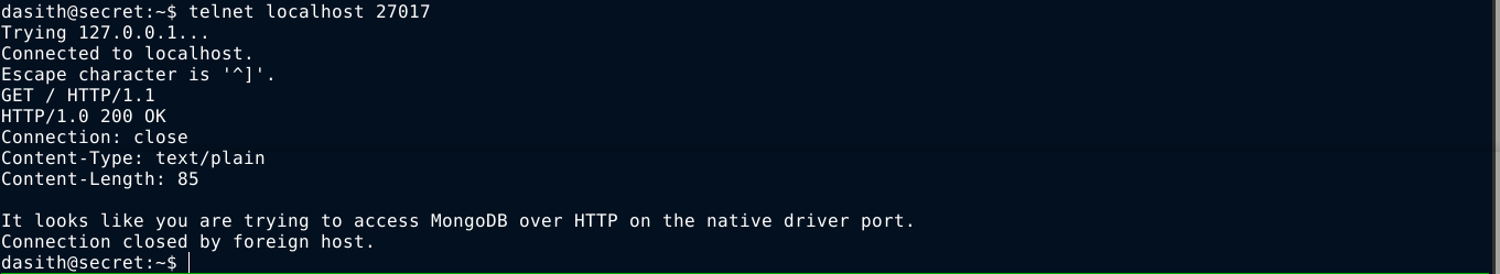 Can’t list sudo permissions for the user as I still don’t have his password. netstat showed a service running locally, which was identified as MongoDB using telnet;