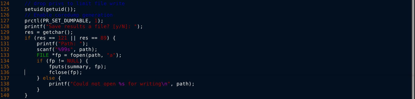 Fuzzing the program’s input did not cause the program to crash. After taking a sanity check, I realized I could cause a program to crash and dump core by sending it a SIGSEGV (signal ID: 11). Running kill -n 11 <PID> while the program is asking where the results should be saved, I was able to crash it;