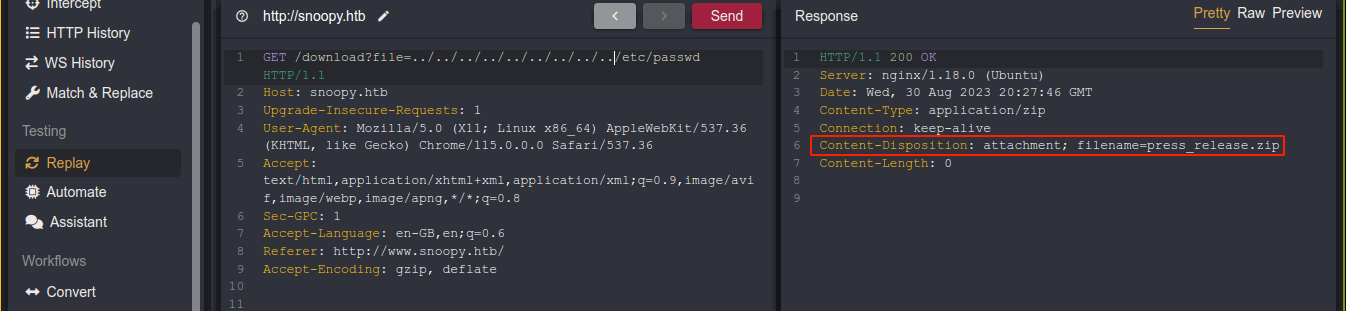 The file parameter looks interesting though. Testing for an LFI, it appears the application is using some filter, and is starting a download for an empty file;