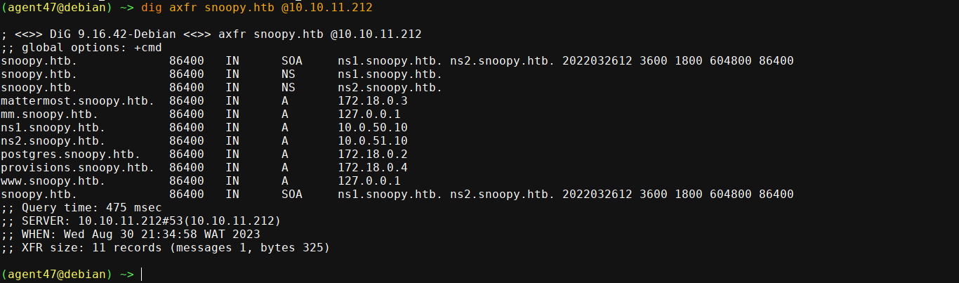 Now that we have a domain name, we can begin poking at the DNS server. Testing for zone transfer, it seems to be enabled, and I was able to dump some DNS records, which I added to my /etc/hosts file;