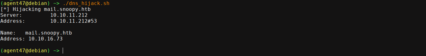 With this key, I wrote a simple script dns_hijack.py for connecting to the server and adding a new record for the mail.snoopy.htb and point it to my box;